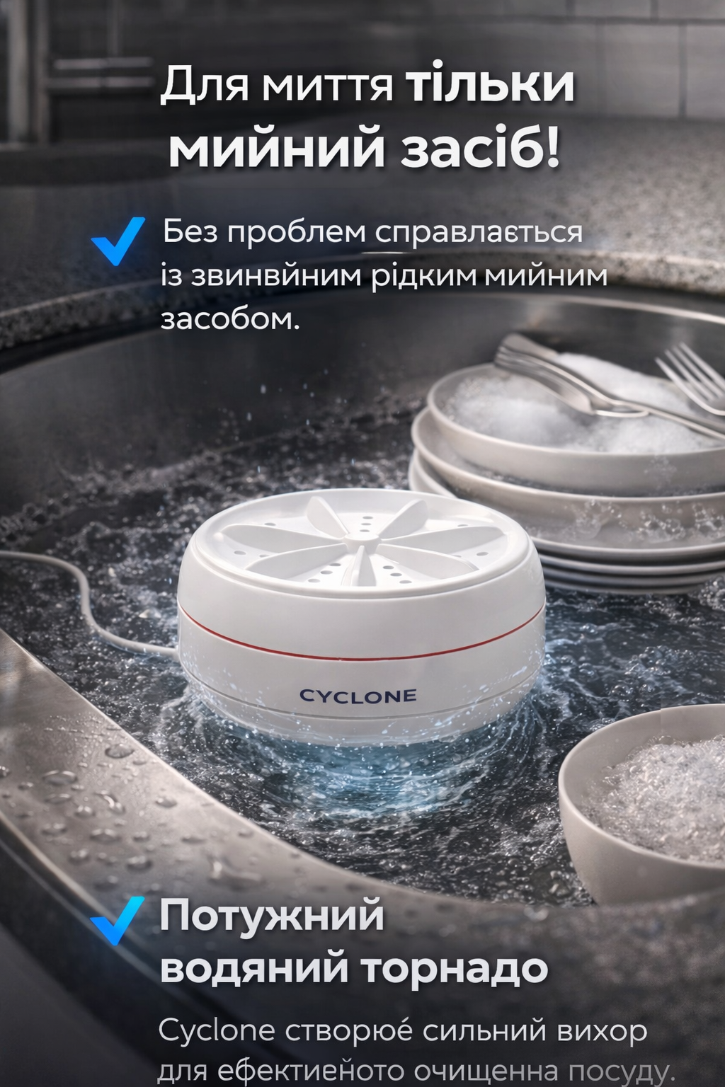 Компактний Cyclone створює потужний водяний вихор, який швидко видаляє жир і бруд прямо у вашій раковині.