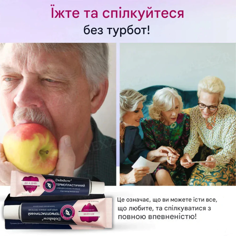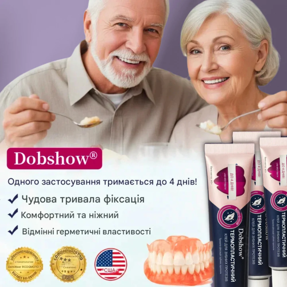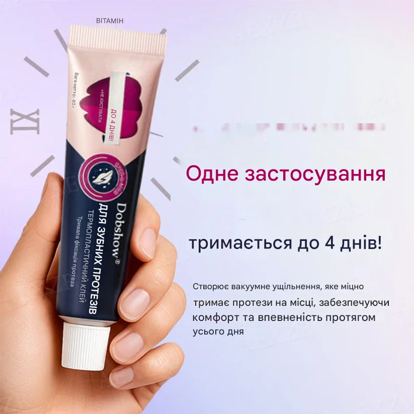 Термопластичний клей Dobshow забезпечує стійку фіксацію зубних протезів без дискомфорту. Безпечний для ясен, простий у використанні та дозволяє впевнено посміхатися у будь-яких ситуаціях.