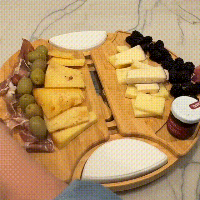 Перетворіть кожну зустріч на витончений гастрономічний досвід із цим круглим набором для сервірування закусок у французькому стилі. Виготовлена з високоякісного бамбука, ця розсувна дошка для сирів оснащена прихованою шухлядою з ножами з нержавіючої сталі та керамічними мисочками для соусів і дипів.
