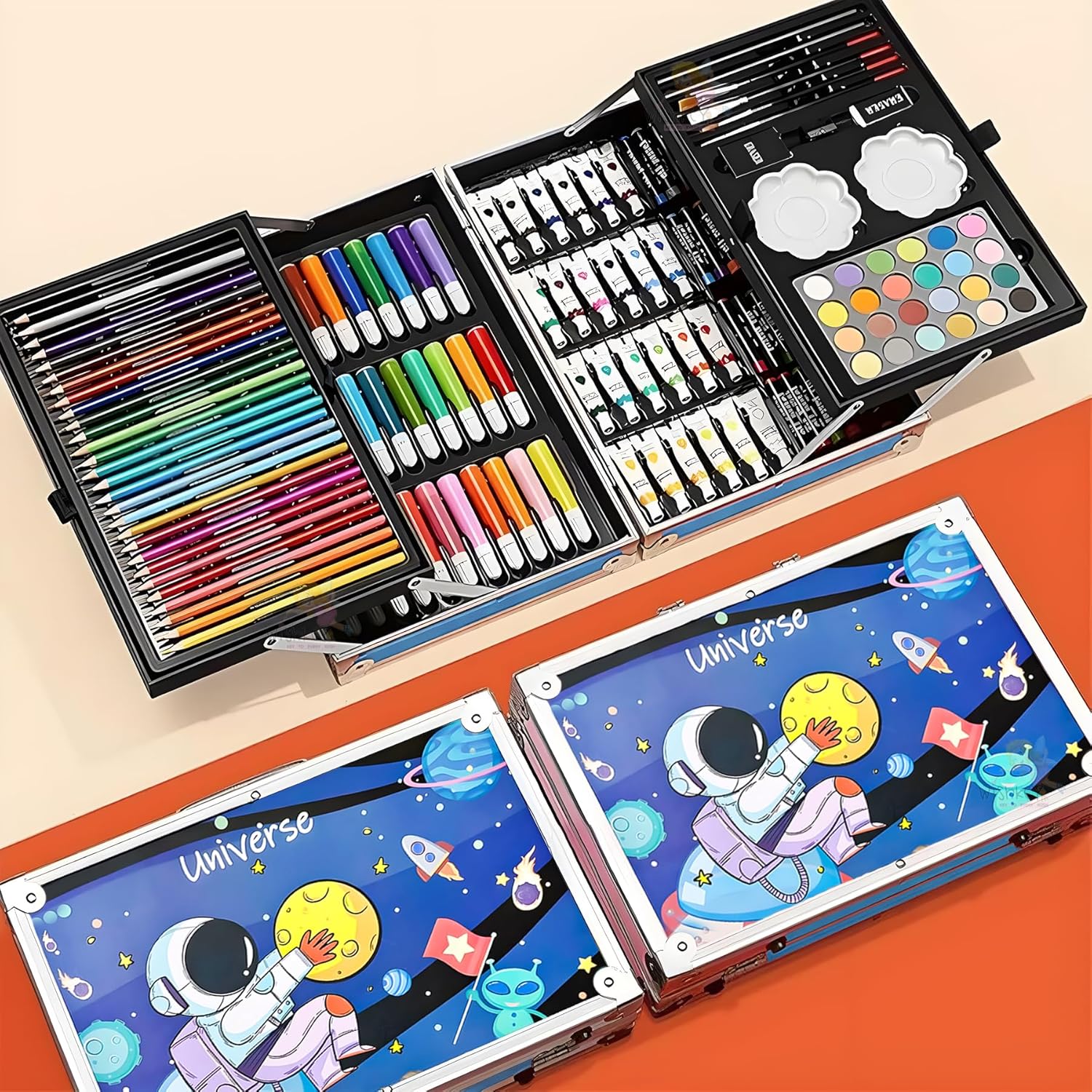 Набір містить 145 предметів для малювання й творчих занять та упакований у стильний алюмінієвий кейс із космічним дизайном.