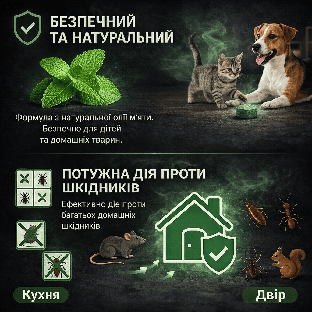 Використовую на кухні в приватному будинку. Запах легкий м’ятний, не різкий. Головне, що безпечний для домашніх тварин.