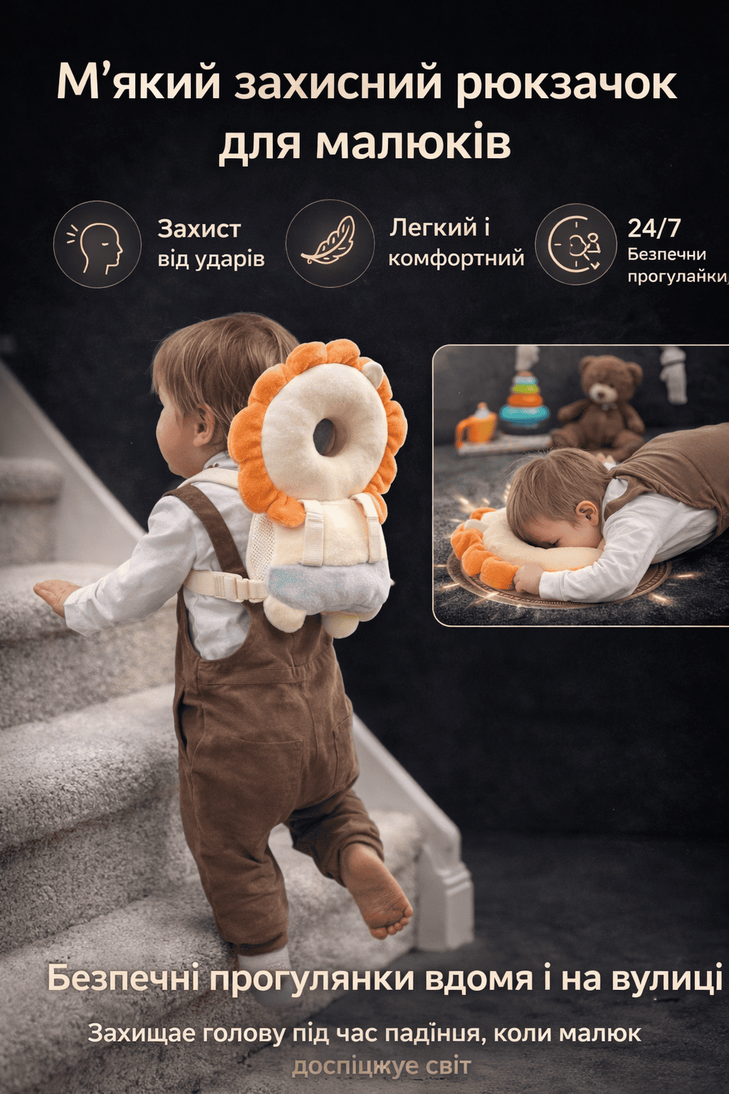 Дуже корисна річ, коли малюк починає ходити. Кілька разів дитина падала назад, але завдяки подушці голова не вдарилась.