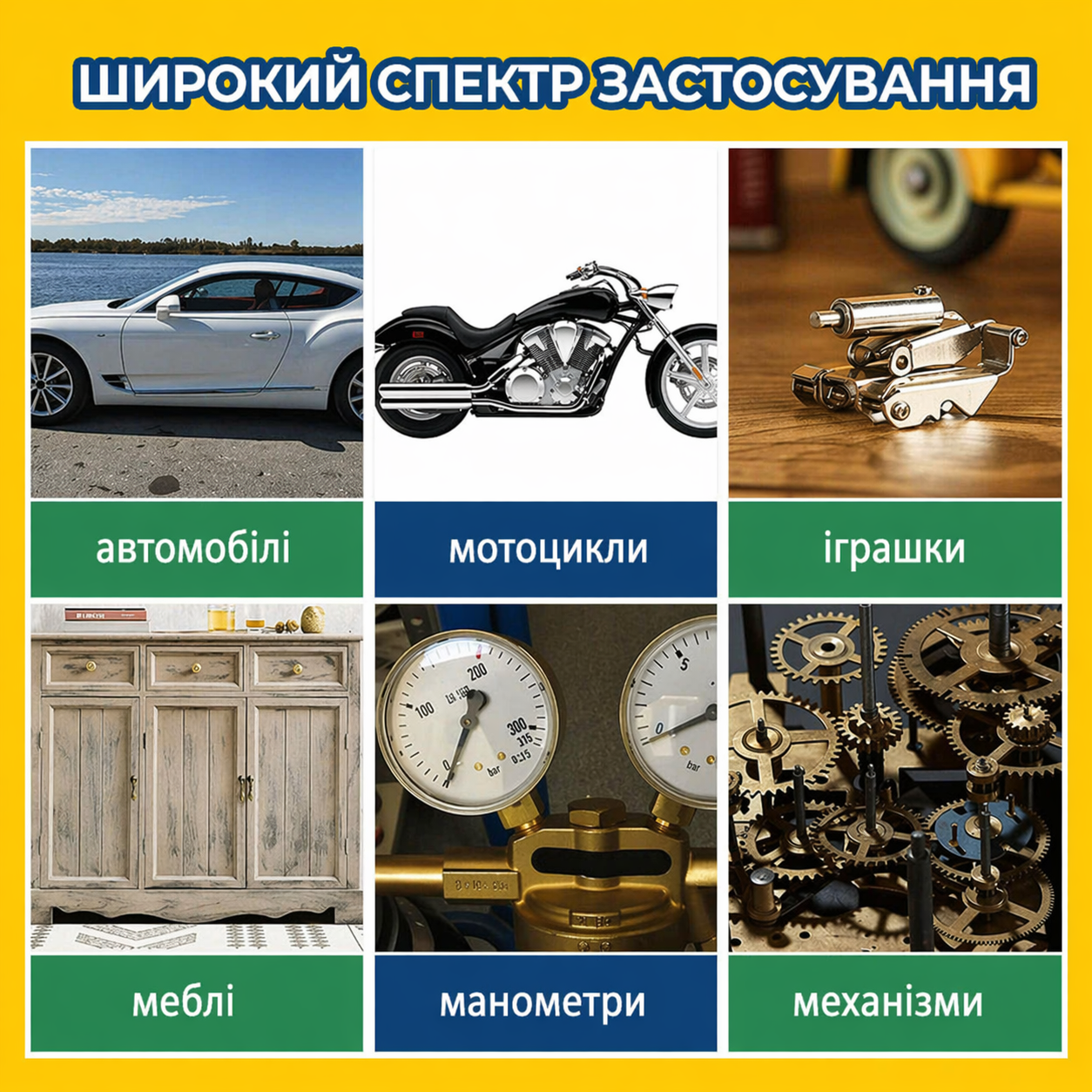 Ідеально підходить для різних поверхонь: автомобілі, меблі, металеві деталі, інструменти та механізми — універсальне рішення для дому, гаража або професійного використання.