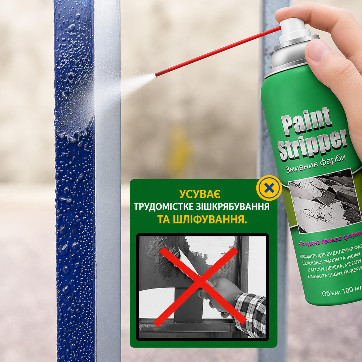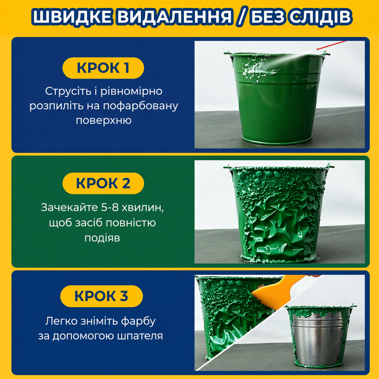Видалення фарби ще ніколи не було таким простим: всього три кроки — розпиліть, зачекайте і легко зніміть покриття без зайвих зусиль та складних інструментів.